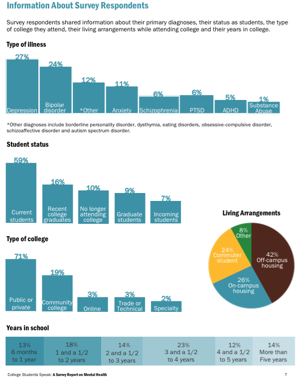 The National Alliance of Mental Illness surveyed college students diagnosed with a mental health condition within the last five years, with 19% of the surveyed individuals being community colleges. Depression and bipolar disorder constituted more than 50% of the respondents' diagnoses. The results across the spectrum were: